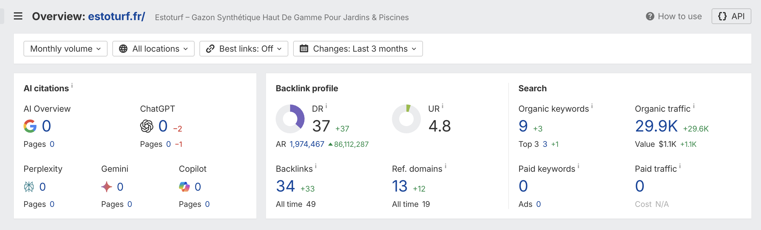 Let’s start with the numbers. Here’s where estoturf.fr stands as of March 2026, according to Ahrefs: