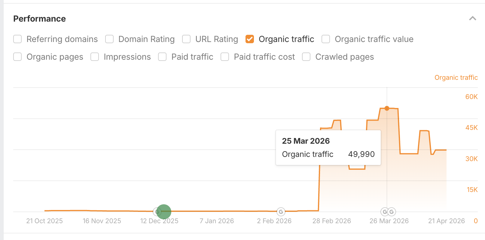 What’s encouraging is the recovery. The site bounced back quickly and strongly, suggesting Google’s confidence in the domain’s relevance to its primary keyword remains intact. For a site with 16 referring domains and 9 ranked keywords, holding a #1 position at 50K monthly visits through a mid-March dip is a reasonable signal of organic resilience.